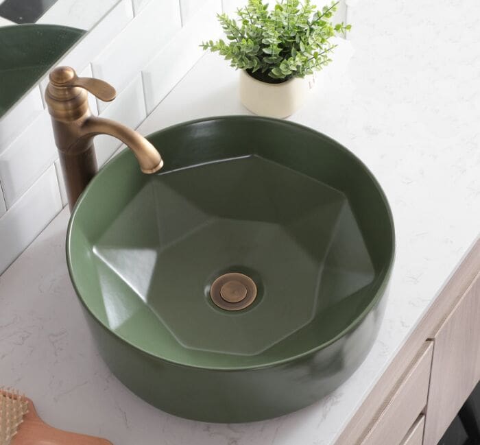 De Evita opzetkom is eenvoudig op een wastafelblad te plaatsen. Het ontwerp past goed bij moderne en minimalistische interieurstijlen. De groene kleur voegt een subtiel kleuraccent toe en combineert moeiteloos met diverse accessoires en kranen.