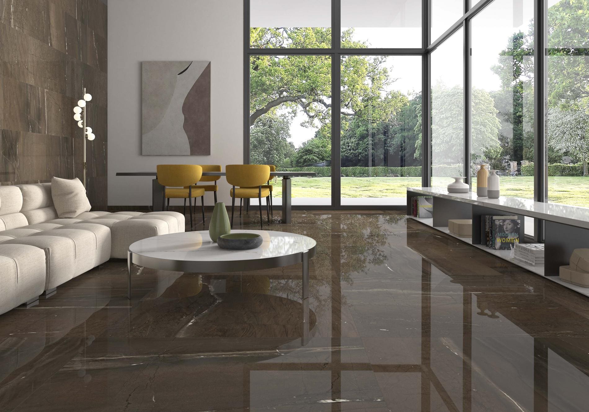 De Lux Jatoba tegel is een exclusieve hoogglans marmerlook tegel met diepe, warme bruintinten en luxe adering.