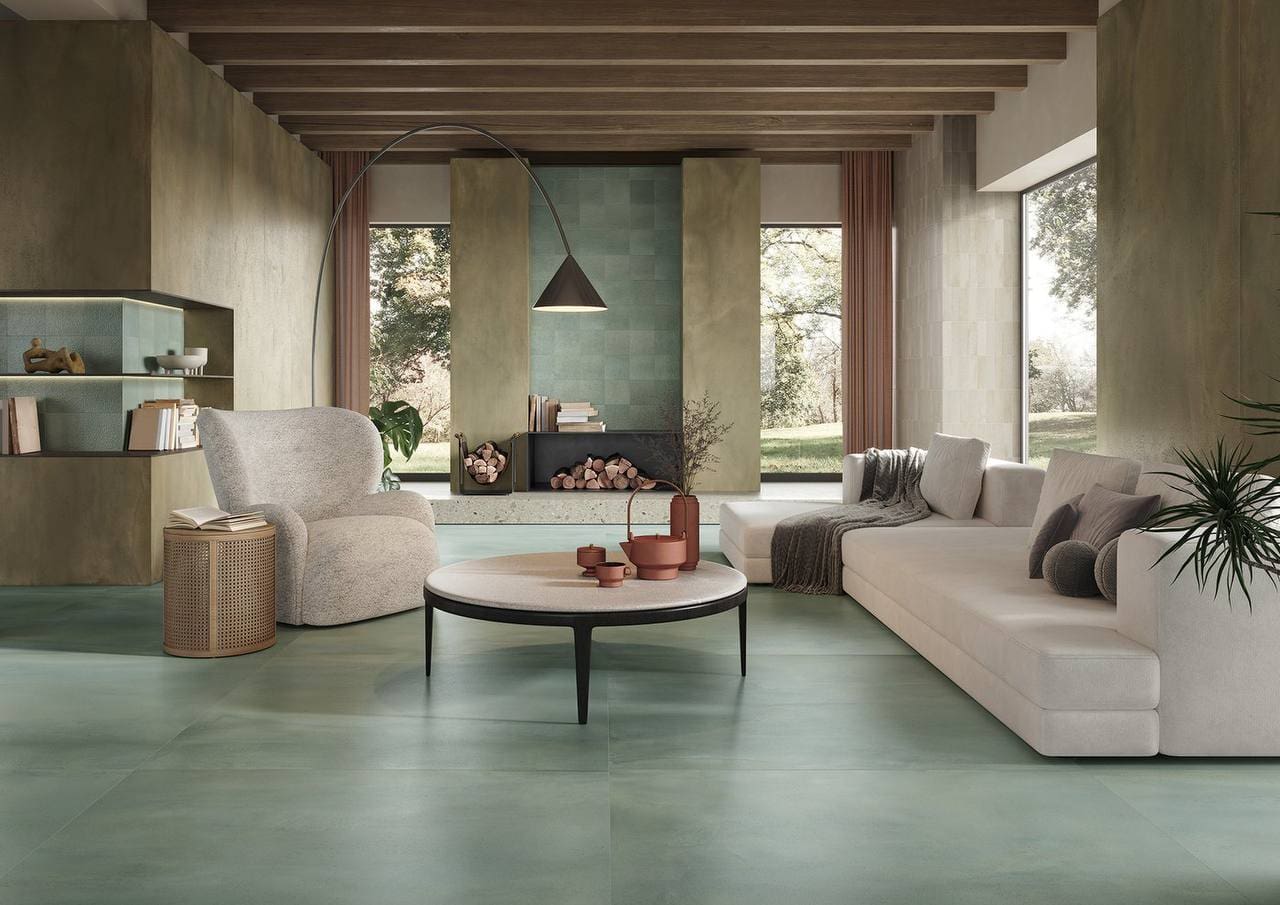 De Vedirame tegel uit de Vulcanica serie combineert natuurlijke kracht met verfijnde elegantie. Deze keramische tegel is geïnspireerd op de dynamische schoonheid van vulkanisch gesteente en de warme glans van geoxideerd metaal. De Vulcanica Vedirame valt op door zijn bijzondere groentint met subtiele koperen nuances – een unieke combinatie die sfeer, diepte en karakter toevoegt aan elk interieur.